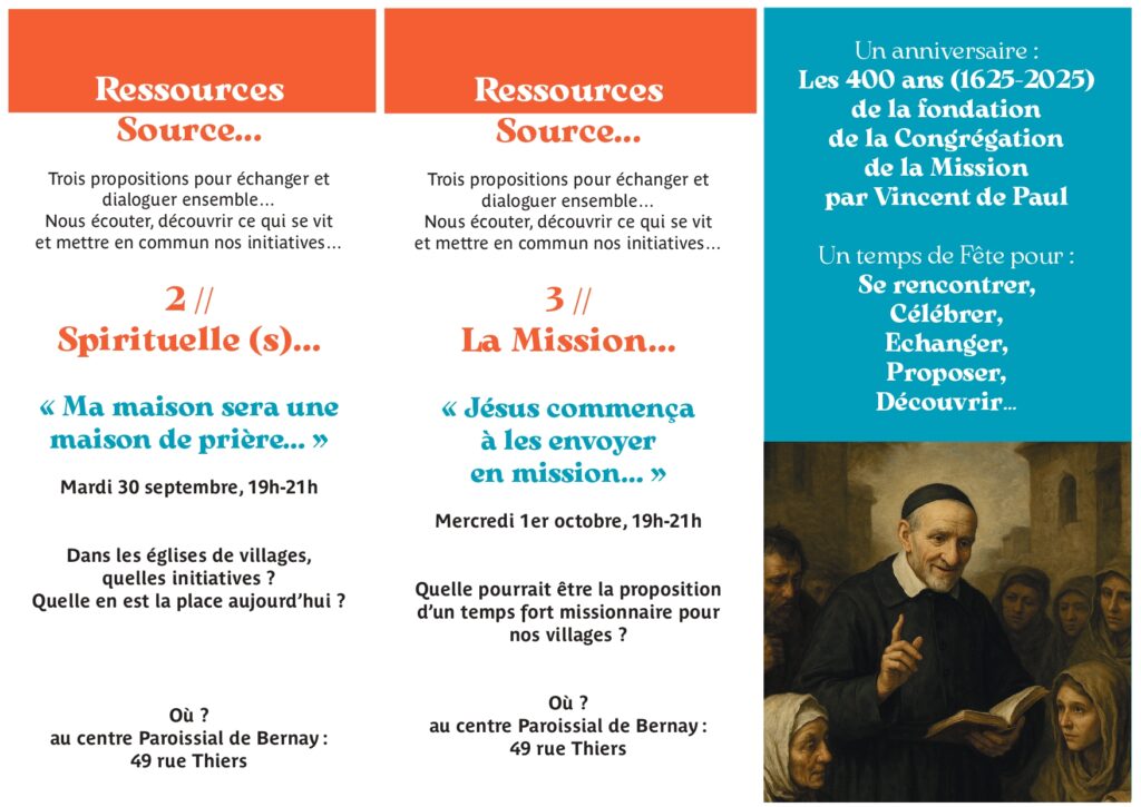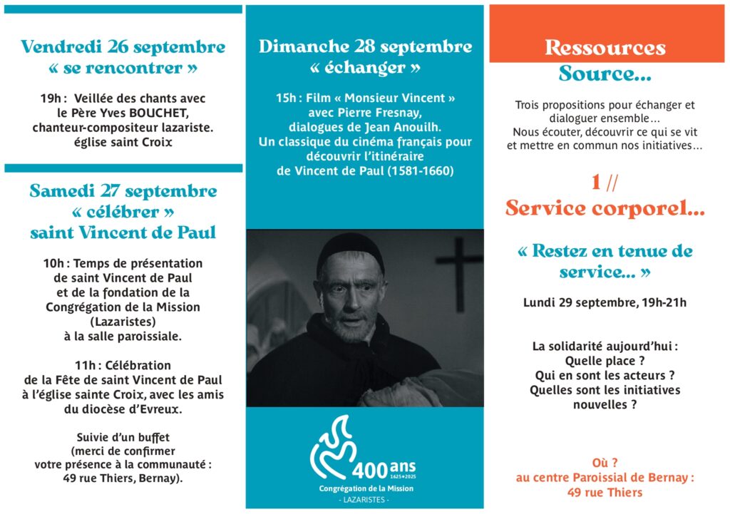 En cette fin de mois de septembre, c’est un anniversaire singulier pour notre communauté car ce sont les 400 ans de fondation des Lazaristes ou Congrégation de la Mission qui administre notre paroisse. Donc plusieurs temps de rencontres, prières, célébration, échanges sont prévus !